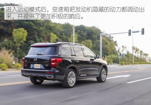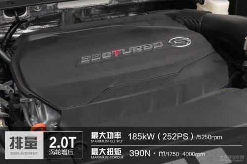 新传祺GS8搭载代号为4B20J1的2.0T发动机,其最大功率为185kW(252PS)/5200rpm,最大扭矩为390N*m/1750-4000rpm,相比320T发动机,最大功率提高25%,最大扭矩提高22%,热效率达到38%,与之匹配的是爱信第三代6速手自一体变速箱,测试车型还搭载了博格华纳第二代i-4WD智能四驱系统。