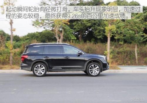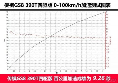 性能测试前,我们先将ESP、空调等全部关掉,采用默认模式起步,动力会分别传到了前后轴,不过在起步瞬间,轮胎有轻微打滑,车头有明显的抬升。整个加速的过程,车辆都比较稳,最终新传祺GS8获得了9.26s的百公里加速成绩,比旧款车型快了整整1s,对于这么一台中型四驱SUV而言,成绩相当不俗。