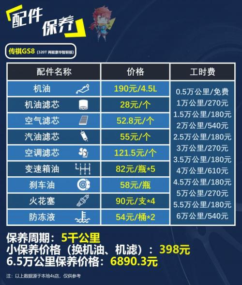 作为国产品牌,广汽传祺GS8在配件价格和工时费上都占有优势,但是5000公里一保的保养周期拖了GS8的后腿,在6.5万公里的周期内,其进店次数明显多于本次调查的其余车型,因此在保养总成本上并无明显优势。