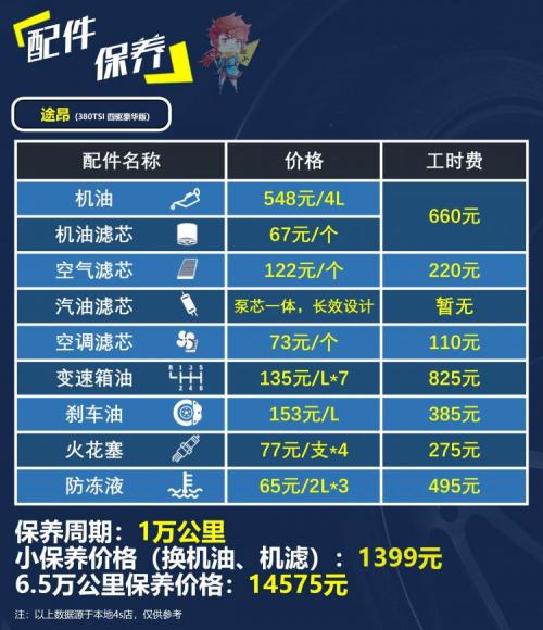 途昂的配件单价和工时费都比较高,尤其是工时费,小保养的工时费基本是汉兰达和锐界的两倍,4s店小保养需要1399元。因此,6.5万公里途昂的后期成本会比保养总价最低的汉兰达高出7859元,整体保养费用为汉兰达的2.17倍。
