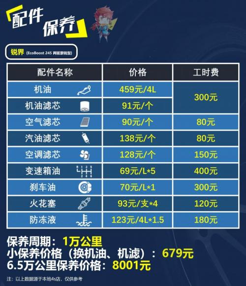 福特锐界的表现中规中矩,其优势在于保养周期长,小保养便宜。但是部分配件的单价和用量偏高使其在6.5万公里的保养周期内表现一般,仅优于比自己大一号的途昂。