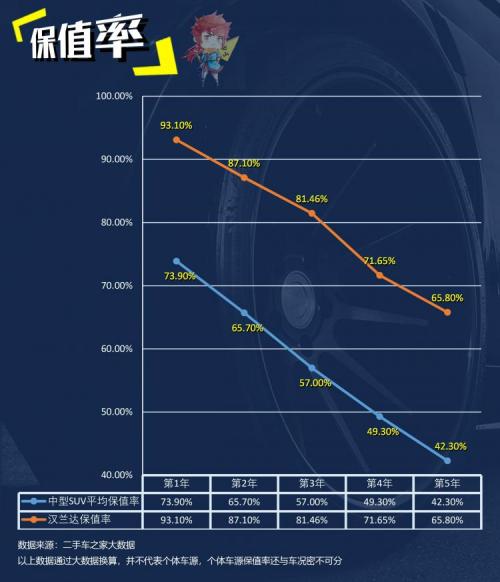 自从2015年第三代汉兰达上市以来,就一直销售火爆。2018年改款汉兰达上市后,补齐了之前汉兰达的配置短板,继续一车难求。这些反映到二手车市场就是汉兰达超高的保值率,基本可以用秒杀同级来形容。第一年93.1%,第二年87.1%,第三年81.46%,第四年71.65%,第五年65.8%,基本上比同级车高20%。如果按购车款30万左右计算,基本上能比竞品少亏6万元!