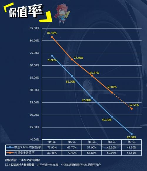传祺GS8于2016年10月正式上市,目前月销量维持在4000台左右。由于时尚的外形设计加上主销车型不到20万的价格,传祺GS8在目前国产中型SUV里算是市场表现最好的。其保值率也比较高,第一年为81.46%,第二年为72.4%,第三年为65.87%,第四年为59.06%,由于上市时间不足五年,因此第五年的保值率为预估值,总体来说高于中型SUV平均水平。