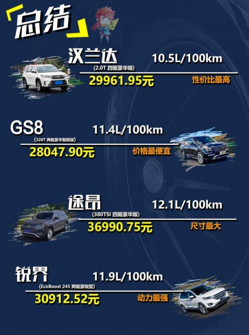 从本次调查这四款最热门的七座SUV来看,途昂的优势在于其大一圈的外观尺寸,GS8则在售价上比较有优势。福特锐界在动力参数上表现出色。汉兰达则在油耗、保养成本上取得优势明显。再加上碾压同级的保值率,后期消费升级换车时也能少赔两三万元,整体性价比最高。