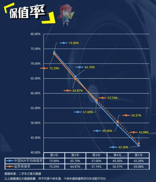 作为国产大众尺寸最大的SUV,途昂在上市之初就以“大”这个独门秘籍取得了不错的销量,一度需要加价5万才能提车。随着时间的推移,途昂的行情也逐渐稳定,目前途昂基本上可以现车销售且有1万元左右的现金优惠。就二手车保值率而言,途昂目前表现基本和中型SUV平均值持平,稳定在第一年73.29%,第二年64.87%,第三年57.74%这样的水平。