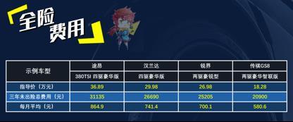相比于交强险,商业险的选择就灵活多了,可以根据自身需求选择保险公司和险种。一般保险公司都会以返现或者赠送油卡/礼品等形式来吸引消费者投保,在投保时建议选择比较资深的大型保险公司,以免出现拒赔的情况。下面我们就以途昂、汉兰达、锐界、GS8最受关注车型为例,替大家算算保险需要花多少钱。