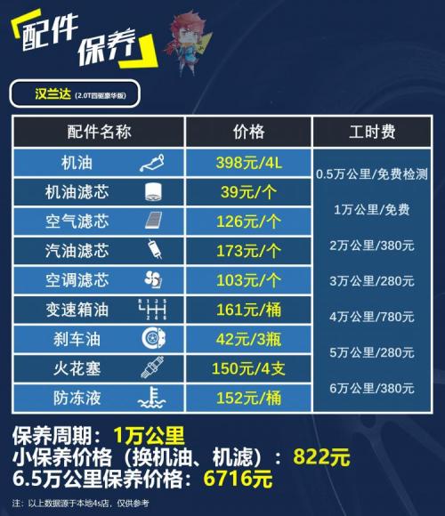 综上所述,就本次调查的四款SUV而言,汉兰达在保养周期、配件单价、工时费三个方面表现最为均衡,体现出日系品牌后期保养成本低的特点,也因此成为本次调查中6.5万公里保养费用最便宜的车型。