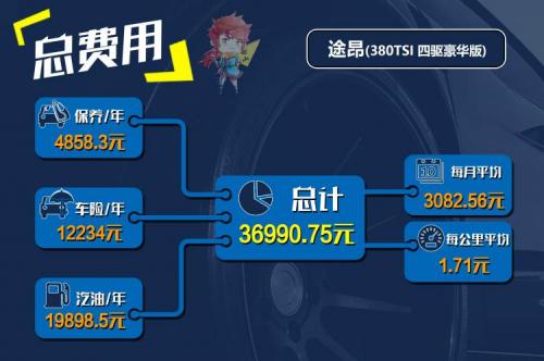 作为尺寸大一号的中大型SUV,途昂380TSI四驱豪华版的全年用车花销约为36990.75元,每月平均为3082.56元,每公里平均为1.71元。和汉兰达、锐界等跨级竞品差异比较明显。总的来说,动力偏肉,保养偏贵的途昂是一个主打差异化的产品。在品牌附加值,车身尺寸上有其独特的优势,但是较高的维护费用和相对较低的二手车保值率也是喜欢途昂的朋友需要考虑的。