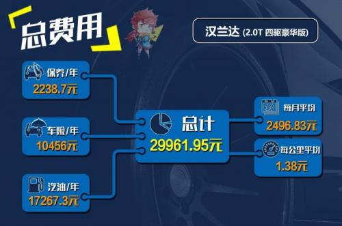 作为一款合资车型,在车价和车险花销上明显高于国产传祺GS8的汉兰达,在后期维护费用上几乎和国产传祺GS8一致,明显低于同级别合资竞品。其全年总用车花销约为29961.95元,约合每月2496.83元,每公里1.38元。这主要得益于其良好的燃油经济性表现和较低的保养费用。总体而言,每月2500元左右的养车费用对于汉兰达的潜在消费者来说完全可以接受。