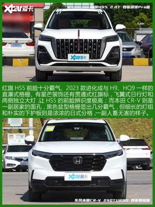 东风本田CR-V(参数|询价)是这一级别合资车型的代表,曾经和大众途观、东风本田CR-V、和丰田RAV-4以及日产奇骏(参数|询价),几乎瓜分了中国中型城市SUV的市场。如今随着中国市场的内卷,东风本田CR-V等一众合资SUV也下探到15万元区间,更低的价格以及CR-V多年来积累的口碑人气,让它的月销量一直维持在一万辆以上,今天我们就来对比红旗HS5和东风本田CR-V这两款有故事、有情怀的中型城市SUV。