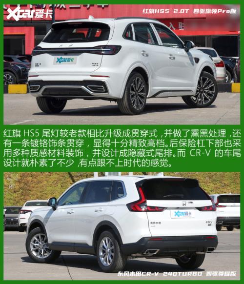 红旗HS5造型更大气动感,大尺寸轮圈和四轮四角以及内收的乘员舱给人很厚重的感觉,外部细节设计和用料都很高档,而红旗特有的造型元素也让人爱不释手;东风本田CR-V则保持了本田车一贯的朴实设计,近似方盒子的造型让有限的车身尺寸里创造出更大的空间,适合低调的消费者。