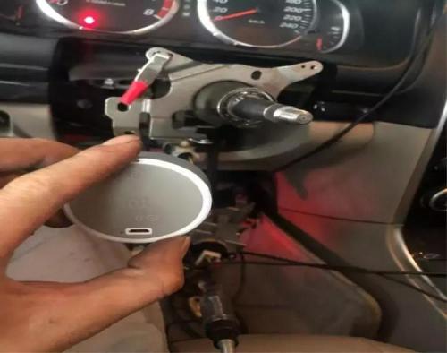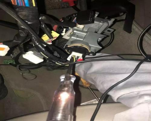 从点火开关处开始检查,用测试灯在点火开关上的电源插头上找到了ACC线,拧到ACC档测试灯点亮。如下图。
