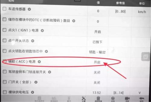 遥控功能由智能钥匙控制模块负责,进入无钥匙启动系统查看数据流。发现一个很奇怪的现象,在“辅助(ACC)电源”这一项数据流中,无论是打开点火开关还是关掉点火开关,一直都处于开启的状态。点火开关打开到ACC档,音响点亮,关闭点火开关音响也跟着关闭,说明供电正常不存在ACC常通的情况。但是数据流一直显示开启,智能钥匙控制模块认为车辆打开了ACC档,所以才会出现遥控失灵的情况,接着重点检查ACC相关线路。