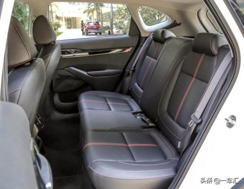 车内座椅表面为仿皮材质,在红色饰条和缝线的点缀下多了一些年轻时尚气息,座椅造型宽大饱满,内部填充较为厚实;前排主副驾驶位均为手动调节方向,且副驾驶位无法控制位置高低。后排座椅延续了前排设计风格,地板中间的轻微凸起,对舒适性影响不大;后排提供了空调出风口和电源接口,但没有中央扶手功能。可开启式全景天窗在智慧版上同样为设计选装包配置,包含车顶行李架、LED大灯、镜面轮毂、双色车身在内需要8000元;后排座椅靠背支持按比例放倒,进一步提升车内实用空间。
