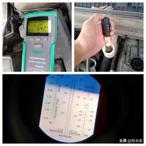 下面检查电瓶和全车油液,冰点检测仪显示防冻液冰点为-36度,而且液面显示水位在上下限刻度之间,目前不用添加,看来这个冬天可以安然度过;刹车油也没有异常;电瓶检测仪显示电瓶寿命为100%了,可以继续使用。这样来看,这辆车应该是原车主刚做过保养的,后期客户小哥可以直接“拎包入住”,整备的钱都省了~机舱整体情况先来看来还是不错的,不过发动机的情况一会儿还要上架看完才知道,现在检测内饰。