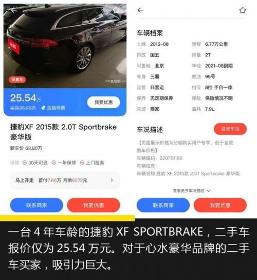 重点来了,二手捷豹XF SPORTBRAKE的价格非常低,一台4年车龄的二手车,报价仅为25.54万元。保值率低对于新车而言是缺点,然而对于二手车而言,保值率的影响其实并不会像新车那么恐怖,25万买一台二手车,使用3年以后就算它保值率再低,也不能再贬值百分之五十了。所以对于目标是二手豪华品牌的买家,捷豹XF SPORTBRAKE无论品牌吸引力、驾驶感、实用性,都是非常具有吸引力的。唯一可能要做好准备的就是接受它并不低廉的保养成本。
