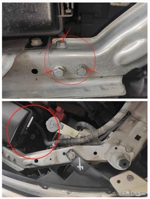 然后发现前端水箱框架总成右侧螺丝拆了,但我仔细检查了一下,发现是因为蓄电池刚好在下边,如果需要更换蓄电池就需要拆卸水箱框架右侧部分,这也是为啥左侧是焊接而右侧是螺丝连接的原因。