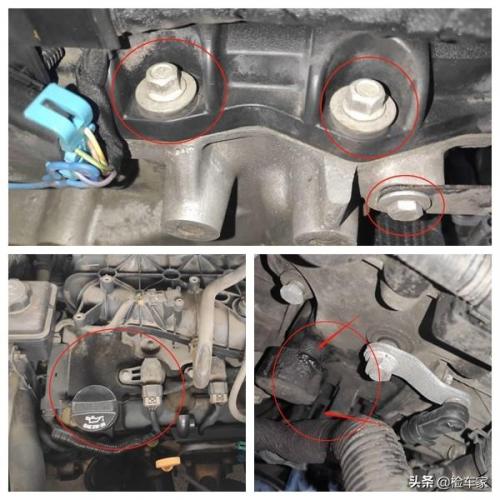 来看看其它地方,发现气门室盖螺丝完好,然后把发动机罩盖拆了,可以看见注油口周围还是有油渍的,这需要清洗一下后期观察,这个正时侧盖边缘也有油渍,不过渗漏还好,可以观察使用,都不是太大的问题,毕竟一台8年的美系车了,有点小毛病是正常的。