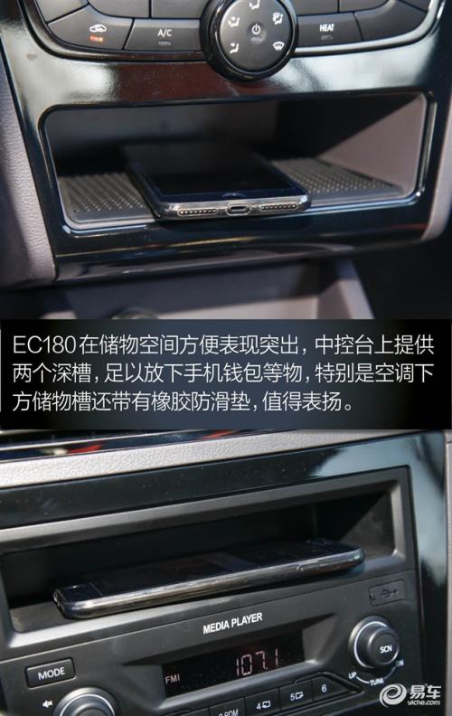内饰设计层面并没有太多亮点可言,简单平直的线条规划出各个功能区域,在有限成本面前做到这样顺手好用就已经足够了。不过我倒认为EC180是我开过这个价位电动车中内饰最友好的,因为做得很像汽油车,如果不看仪表盘的话很难看出其电动车的身份。在我看来这是优点,因为太多走实惠路线的电动车内饰设计就好像生怕别人不知道这是辆电动车似的,生硬地加入很多标榜“电动”的元素,那样为了存在而存在的设计我实在不太认同。