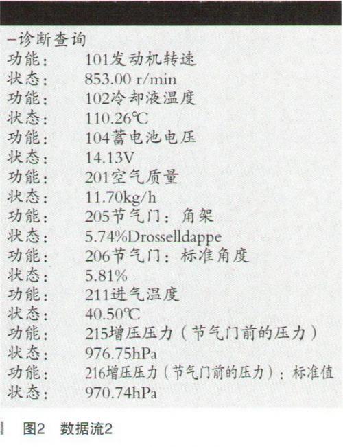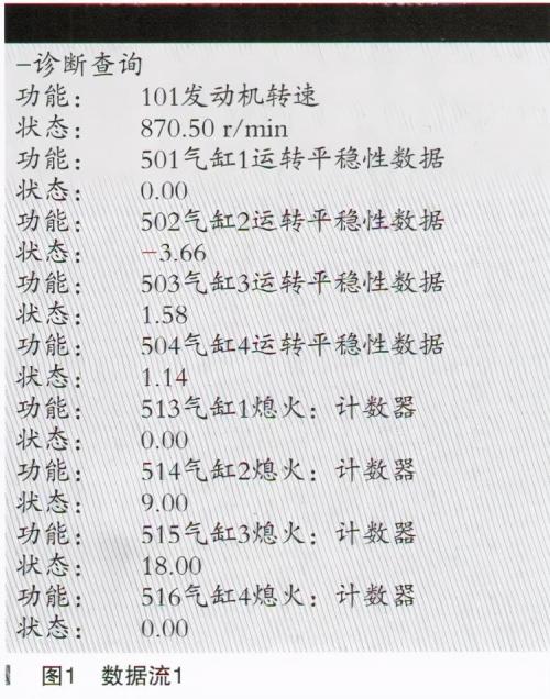 故障诊断:接车后首先验证用户反映的故障现象,经确认每次在发动机刚启动时发动机抖动的比较厉害,可以感觉到车身晃动,大约10s后,发动机又运转平稳,没有发动机故障报警。在刚启动后挂入D挡或R挡发动机抖动更加明显。连接ISID过断于诊断检测,发动机控制系统没有相关的故障存储。调取发动机控制单元功能,读取发动机相关的数据流,如图1所示。观察发现发动机平稳值和逻辑计数器,发动机在刚启动前十多秒,第2缸、3缸平稳值较大且逻辑计数器显示2缸、3缸熄火次数分别达到9次和18次
