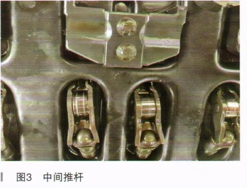 当拔下VANOS电磁阀插头,让VVT进入应急模式后,发动机就不抖了,分析是VVT系统是否存在故障。分别与正常工作的车辆对调了进、排气VANOS电磁阀试车,故障现象还是存在。拆卸气门室盖,检查VVT系统的机械机构,发现第2缸、3缸的中间推杆有不同程度磨损现象,并且有非常明显的拉伤痕迹,如图3所示。