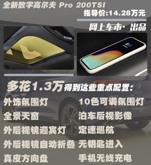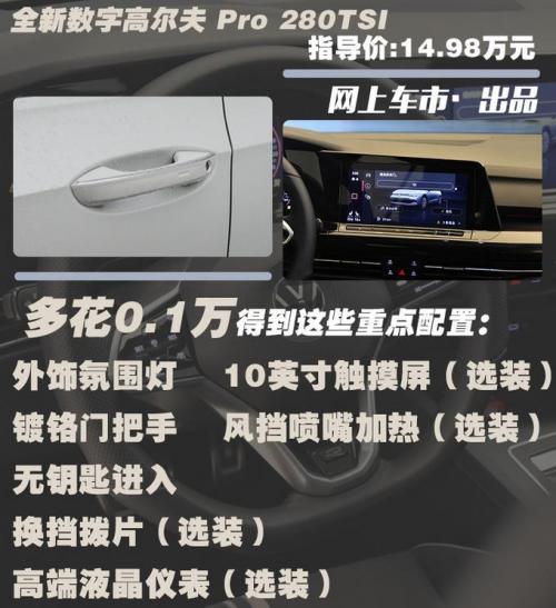 首发版和Pro 280TSI可以一起说,因为二者之间只差了1,000元,而配置方面却差了不少。包括无钥匙进入、镀铬门把手、外饰氛围灯等。而且Pro 280TSI版本支持购买选装包,可以根据自己的需求选装配置,比如有换挡拨片、高端液晶仪表、10英寸中控屏幕等。所以全新数字高尔夫Pro 280TSI是1.4T动力中最推荐入手的配置车型。
