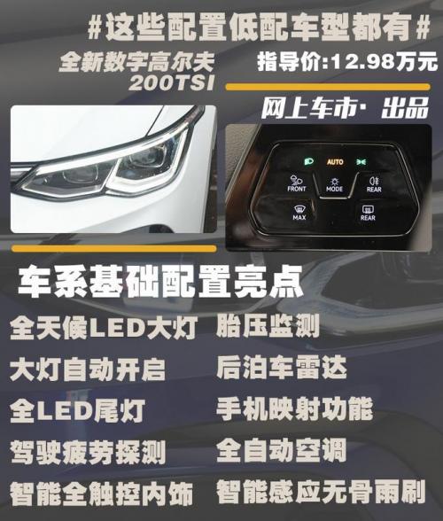 全新数字高尔夫200TSI版是最入门的基础版本,也是1.2T车型中最值得推荐的版本。因为它配备了全LED大灯/尾灯、大灯自动开启、疲劳驾驶检测、全自动空调等功能,已经达到了比较高的配置水平。另外,第八代高尔夫主打智能、科技化,内饰方面,新车采用智能全触控内饰,标配胎压监测、后倒车雷达等安全配置,完全符合家用的基本需求。