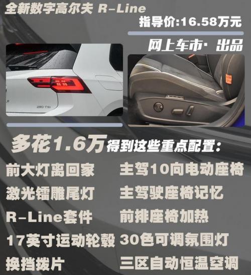 R-Line版是顶配版,也是第八代高尔夫最亮眼的配置车型,相比Pro 280TSI贵了1.6万元,无论是外观还是配置都达到了车型的最高标准。比如此次新车宣传的IQ.LIGHT智能灯光系统,也在该配置车型上有所搭载。另外,R-Line版还配备了主驾驶席10向电动调节座椅/记忆、前排座椅加热以及三区自动恒温空调,符合追求顶配同时预算又比较充足的消费者。