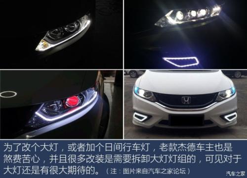 来看看设计吧。厂家介绍新款杰德的定位要更年轻一些,定位在85后人群,所以细节修饰更大胆。外观设计上的变化主要是在一些细节方面,LED大灯以及一些镀铬装饰。高配车采用LED头灯,跟思域、雅阁的头灯造型一致,中低配车型采用的是普通卤素灯泡。老款车型则是在顶配车型上有LED近光灯。