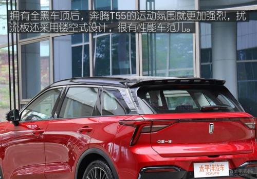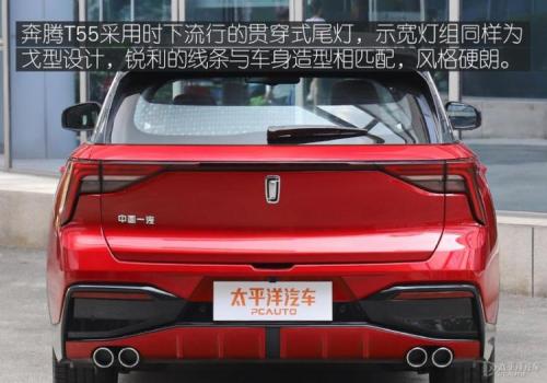 奔腾T55采用了光影哲学3.0之性感曲面的设计语言,让人在不同位置看都能有不同的视觉效果,前进气格栅看起来相当硬朗,内部还有点阵式镀铬装饰,细看后你会发现是呼应品牌LOGO。车尾的运动氛围更加浓厚,除了大尺寸的后扰流板外,还采用了双边共四出的排气管口装饰,光是样子就很唬人了。