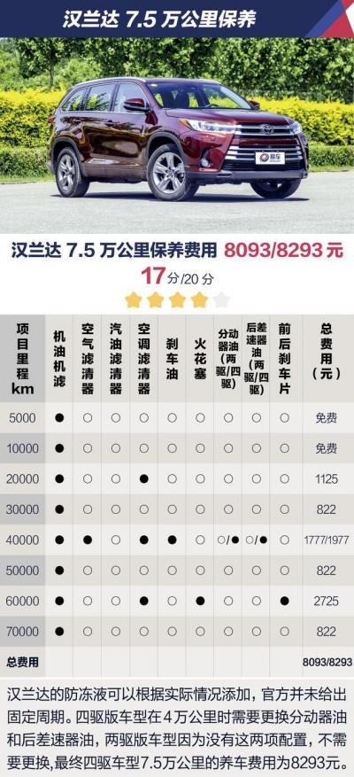 此次入围的5款车型中,只有汉兰达的整车质保期为3年或6万公里,与其他四款车型的3年或10万公里相比,并无优势。好在,其10000公里的保养周期较长,加上它的更换配件项目相对较少,使得最终汉兰达在7.5万公里时的养护费用只有8293元,这个价格在同级车型中优势非常明显,甚至要低于部分自主车型。