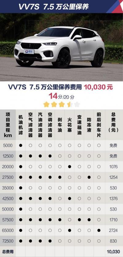 首先说说VV7s,唯一的自主车型,豪华品牌的定位并没有让VV7的养护费用水涨船高,7.5万公里,10030元的价格并不难接受。昂科威和冠道的保养周期同样为5000公里,这也是导致这两款车型后期价格偏高的主要因素。