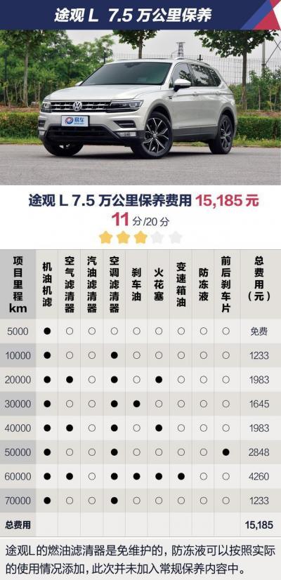 相比不少同级SUV车型,途观L 1万公里的保养周期有显著优势。在配件质量可靠、耐久性强的基础上,更长的保养周期可以适当减少用户进店保养的频率、节省用户的时间成本,这对于潜在消费者们来说是一个值得关注的细节。不过,由于大众在配备价格上并不实惠,工时费的价格也达到了更高级别车型的水准,而最终7.5万公里时的保养费用达到了15185元,是5款车型中最高的。