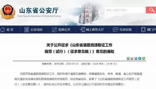 9月30日,山东省公安厅发布新的测速取证规范征求意见稿,以文件的形式规范限速测速,文件于2018年11月1日正式生效。