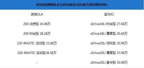 此次我们选取了奔驰GLA 2019款GLA 220 4MATIC运动型和宝马X1 2019款sDrive20Li领先型进行对比。奔驰GLA 2019款GLA 220 4MATIC运动型官方指导售价31.80万元,宝马X1 2019款sDrive20Li领先型官方指导售价30.98元。看这两位争锋的勇士谁更加亲民,谁更值得消费者青睐。