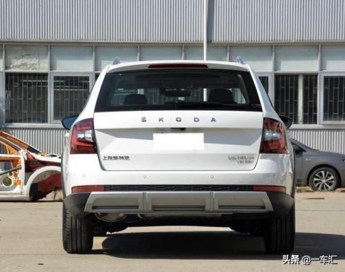 倾斜的尾门和后风挡让车尾看起来更像是一辆两厢轿车,车顶扰流板中间集成了高位刹车灯带,尾门中间车标换装了斯柯达英文标识,相比传统车标样式要更显高级一些;尾灯完全位于两侧车身表面,为了起到更好的警示作用,采用了更宽大的造型设计,表面熏黑处理的灯罩配合内部LED灯带,点亮后具有较高的辨识度。车尾底部同样加入了大块凹凸有致的银色护板,与车头部分起到前后呼应,左侧底部隐藏式单出排气,让车身在气势感上稍微逊色了一些;车型配备了后方倒车雷达和倒车影像功能。