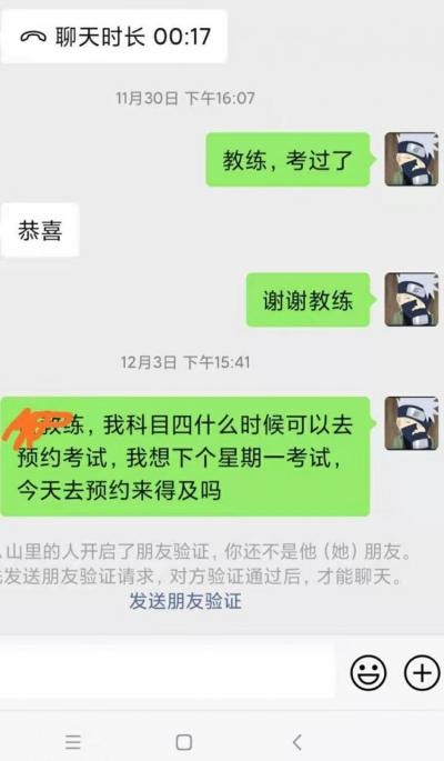 约了7号考试,然后就短信问了一下一起考试科目三的学员什么时候考科目四,他说科目四需要到驾校申请,在app上面不行,我完全不知道,也从来没人跟我说过,就跟考完科目二要分教练的事情一样,没人跟我讲,所以我就去问科目三教练,没想到已经把我给删掉了,我只能跑到驾校去问,我离驾校二十多公里,我giao。