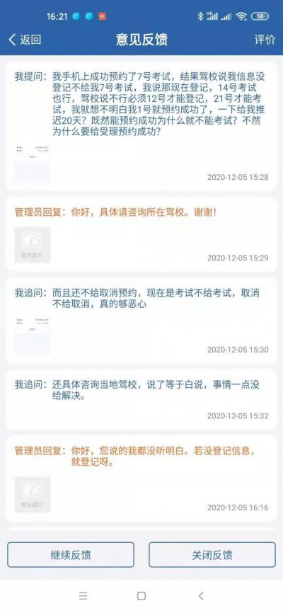 行吧,去就去吧,没办法,结果到那里,那个工作人员说星期六才能预约,好吧,我回来等到5号星期六又去了,那边工作人员告诉我说你12123上面是不是预约了7号考试,我说是的,工作人员说科目四要到驾校来预约的,你这上面显示成功了,也不能考试,what?我很生气,但是没办法,那我说那帮我取消吧,我现在预约到14号再考,工作人员又说,不行取消不了,只能等下个星期来预约,而且只能预约21号考试了,我都tm要骂人了,考试不让我考,取消也不让我取消,就硬让我等20天,真服了,一怒之下在app上提反馈意见,结果客服的理解能力也真是醉了,最后都把我给气笑了。