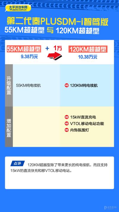 接下来是120KM超越型,对比55KM超越型它们之间差价为1万元。但是带来纯电续航里程去到120km,同时还支持15kW的直流快充功能和移动电站,使得消费者拥有更长的纯电出行体验。
