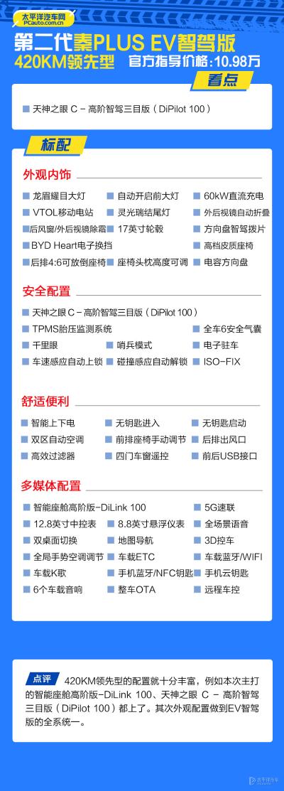 第二代秦PLUS EV智驾版的入门车型,420KM领先型的配置就十分丰富。例如本次升级的两大重点,天神之眼C -高阶智驾三目版(DiPilot 100)和智能座舱高阶版-DiLink 100都配上,另外外观和内饰配置基本做到全系车型一致。