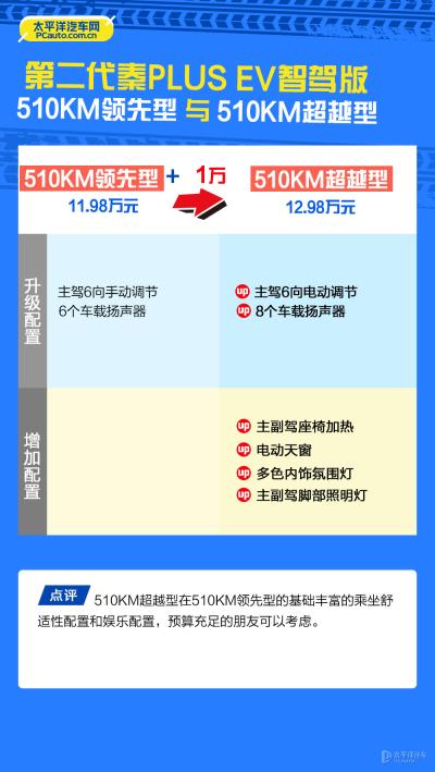 顶配510KM超越型相比510KM领先型的差价为1万元,但是在后者基础上完善了一些舒适便利性配置,例如主驾电动座椅调节、座椅加热和车内氛围灯等。预算充足的朋友直接上顶配没问题。