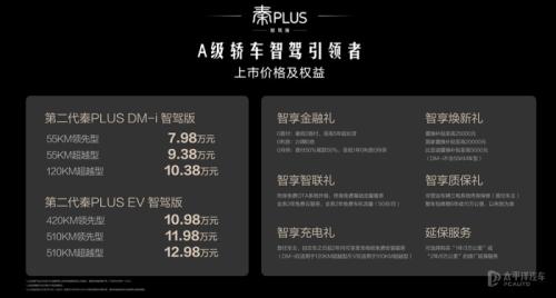 【太平洋汽车导购频道】过去2024年家轿销冠比亚迪秦PLUS(询底价|查参配)迎来重大更新,第二代秦PLUS智驾版搭载天神之眼C -高阶智驾三目版(DiPilot 100),而且DM-i版本用上了第五代DM技术。2月10日,第二代秦PLUS智驾版正式上市,包含插混和纯电两种动力,共6款车型,插混版本售价区间为7.98万-10.38万元,纯电版本售价区间为10.98万-12.98万元。