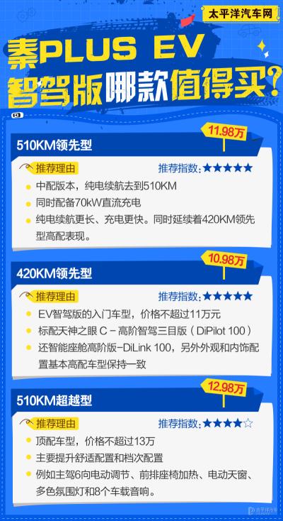 来到510KM领先型,首先纯电续航升级到510KM,充电速率升级到70kW,充得更快,纯电续航更加持久,再加上原有420KM领先型的配置表现,这款车型是第二代秦PLUS EV智驾版里最值得购买的车型。