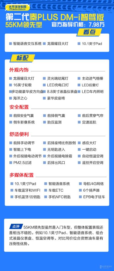 55KM领先型是全系产品的入门车型,但这款车型里面的不少配置项目都能做到标配,当中设计安全、辅助驾驶、舒适及智能等多领域,做到真正的“入门即高配”。能满足年轻家庭首款购车的需求点。