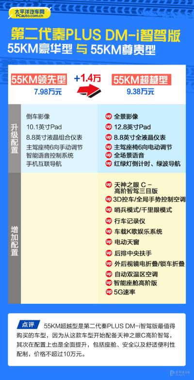 来到55KM超越型,它是第二代秦PLUS DM-i智驾版最值得购买的产品。因为从这款车型开始配备配备天神之眼C -高阶智驾三目版(DiPilot 100),整体采用5R12V方案,29枚高精度智驾传感器、30余项安全辅助功能,包括高快领航、代客泊车等二十余项智能辅助驾驶功能。其次车内Pad尺寸更大,同时还增加了不少舒适性配置。
