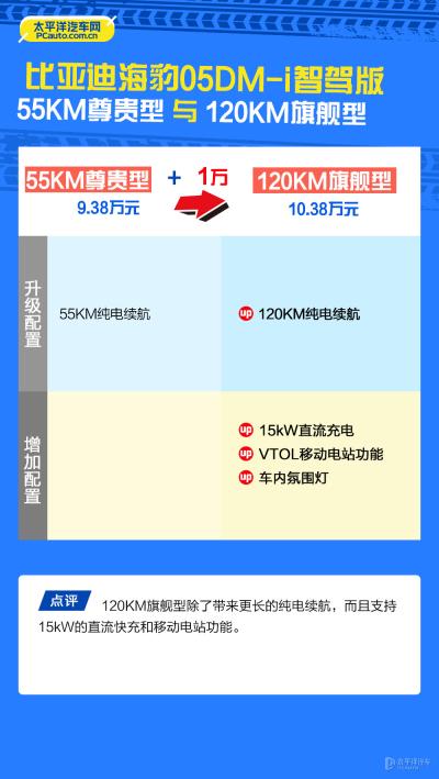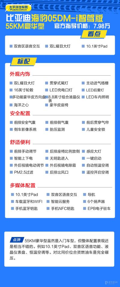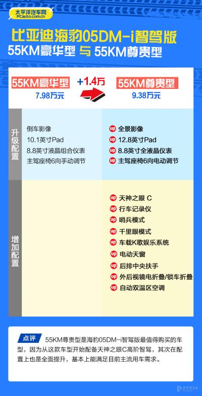 来到55KM尊贵型,它是海豹05DM-i智驾版最值得购买的产品。首先从这款车型开始配备配备天神之眼C -高阶智驾三目版(DiPilot 100),由5颗毫米波雷达,12颗前后向与侧向视觉感知高清摄像头,12颗超声波雷达组成高感知系统,可实现高快领航、代客泊车等二十余项智能辅助驾驶功能。其次车内Pad尺寸更大,同时还增加了不少舒适性配置。