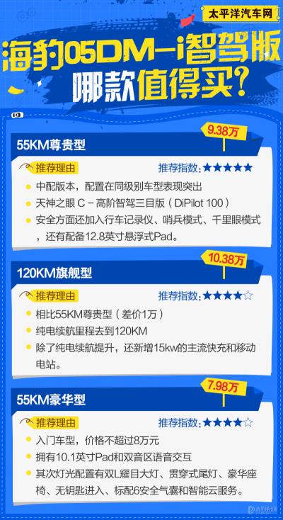 【太平洋汽车导购频道】海洋网这边新推出一款家轿爆款产品,海豹05DM-i(询底价|查参配)智驾版。新车拥有比亚迪全栈自研的天神之眼C -高阶智驾三目版(DiPilot 100)和智能座舱高阶版-DiLink 100,以及第五代DM技术加持。新车共推出三款车型,官方指导价格为7.98-10.38万元。
