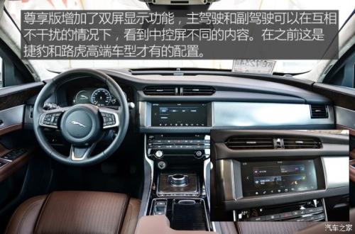 18款车型在外观和内饰上并没有明显变化,配置上增加了双屏显示功能,主驾驶和副驾驶可以在不互相干扰的情况下,看到中控屏不同的内容。在之前这是捷豹和路虎高端车型才有的配置,如今已经普及到XFL上面。