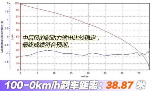 全力制动时车身有点头的现象,但车身总体保持稳定,最终成绩为38.87米,表现符合预期。这个成绩在汽车之家的评价体系中,也属于优秀水平。