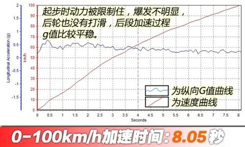 虽然可以关闭稳定系统,但感觉却对发动机输出非常保守,变速箱也不允许拉到很高的转速。起步后车轮没有明显滑动,说明并没有达到最佳输出状态,最终成绩为8.05秒,成绩与老款车型有差距,略有遗憾。